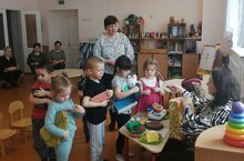 В средней группе прошёл открытый показ сюжетно-ролевой игры «На день рождения к кукле Кате». Детям представилась возможность примерить на себя роль водителя автобуса и продавца магазина. В заключении игры, ребята поздравляли куклу Катю с днём рождения, подарили ей подарки и спели песню «Каравай».