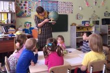 Воспитанники дошкольной группы под руководством воспитателя изучают Глобус...