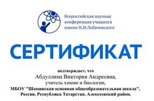Абдуллина В.А., учитель химии и биологии, награждена сертификатом за участие (выступление с докладом) в Круглом столе «Одарённые школьники: выявление, поддержка и развитие. Современные инновационные практики и технологии» в рамках VIII Всероссийской ( с международным участием) НПК им. Н.И. Лобачевского.
