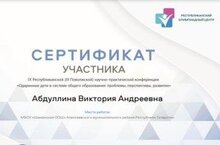 Учитель химии и биологии Абдуллина В.А. награждена сертификатом участника за участие в IX Республиканской (III Поволжской) научно-практической конференции "Одаренные дети в системе общего образования: проблемы, перспективы, развитие"