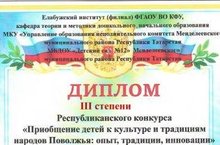 Воспитанник дошкольной группы награжден дипломом III степени за участие в Республиканском конкурсе "Приобщение детей к культуре и традициям народов Поволжья: опыт, традиции, инновации", проводимого на базе МБДОУ "Детский сад № 12" Менделеевского муниципального района РТ при поддержке Елабужского института (филиала) ФГАОУ ВО КФУ, кафедра теории и методики дошкольного начального образования. Куратор: Гайсина Т.В.