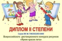 Воспитанник дошкольной группы Абдуллин К. награжден дипломом II степени за участие во Всероссийском дистанционном конкурсе рисунков "Яркие краски лета". Учредителем конкурса является Фонд развития культуры, поддержки детского творчества и помощи детям, нуждающимся в лечении и реабилитации «Подари добро детям». Педагог: Гайсина Т.В.