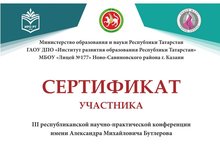 Ученица 3 класса награждена сертификатом за выступление с исследовательской работой "Соответствие кабинетов школы санитарно-гигиеническим требованиям" на III Республиканской научно-практической конференции имени А.М. Бутлерова. Научный руководитель - Абдуллина В.А.