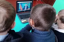 Воспитатель ГПД Хныченкова В.И. с учащимися 1-5 классов посмо трели фильм, посвящённый М.Джалилю и джалиловцам
