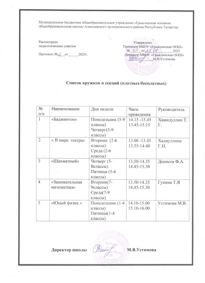 ⇒ Список кружков МБОУ "Ерыклинская ООШ"