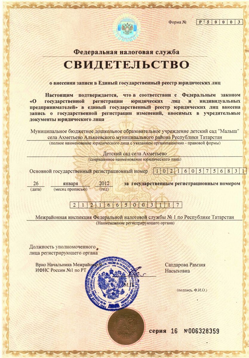 Короткое название: МБДОУ детский сад «Малыш» села Ахметьево Алькеевского МР РТ