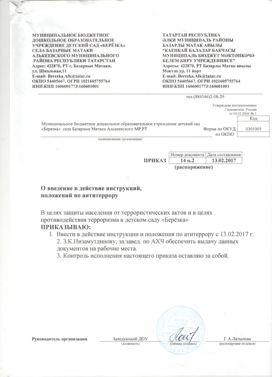 приказ о назначении ответственного за антитерростическую безопасность учреждения