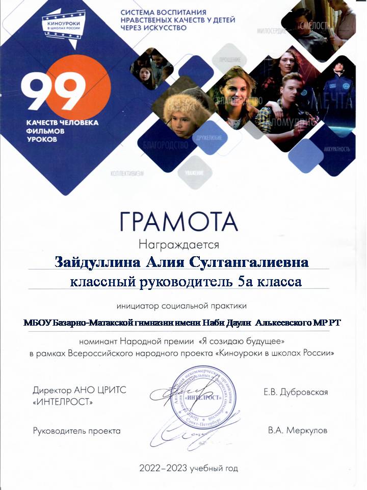 В течение 2022-2023 учебного МБОУ Базарно-Матакская гимназия являлась пилотной площадкой по реализации Всероссийского проекта "Киноуроки в школах России". Цель Проекта – создание инновационной системы воспитания гармонично развитой и социально ответственной личности на основе нравственных ценностей. Миссия Проекта – воспитание поколений выпускников школ 2030-2040 гг. со сформированной широкой библиотекой этических качеств, высоким уровнем социальной и интеллектуальной компетентности.Основой системы воспитания Проекта является проведение социальных практик, реализуемых в соответствии с тематикой просмотренных киноуроков.Цель социальных практик – создание условий для развития у детей и подростков понимания и принятия ценности созидательных качеств личности, формирования потребности в проявлении продуктивной социальной активности. Коллектив гимназии в течение года активно работал по проекту. Учащимися проведено 153 социальных практик. Никто из детей не остался равнодушным. Фильмы вдохновили ребят на свершение добрых дел. За тесное сотрудничество разработчики проекта подарили гимназии книгу из сценариев фильмов. Благодарим команду проекта за сотрудничество, желаем дальнейших успехров и ждем новые фильмы!