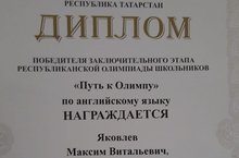 С 20 по 23 января 2023 года на базе оздоровительно-образовательного комплекса «Дуслык» ГАОУ «Республиканский олимпиадный центр» Министерства образования и науки Республики Татарстан проведен заключительный этап республиканской олимпиады школьников по английскому языку для обучающихся 7-11 классов общеобразовательных организаций Республики Татарстан. Призером заключительного этапа республиканской олимпиады школьников по английскому языку стал ученик 8 класса Яковлев Максим. Поздравляем Максима и педагога Леонтьеву Е.Г..