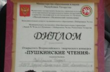 28 марта в Муниципальном автономном общеобразовательном учреждении города Набережные Челны «Лицей № 78 им. А.С.Пушкина» прошел Открытый Всероссийский творческий конкурс «Пушкинские чтения». Ученик 8 класса Хабибуллин И. награжден дипломом 1 степени в номинации «Сценическое искусство». В конкурс было принято более 600 работ, среди которых в конечном итоге было выбрано 20 лучших работ. Второй диплом этого же конкурса Ильдару присудили за высокий профессионализм в проведении мастер-класса в рамках Всероссийской видеоконференции образовательной программы «Гимназический союз России». Конкурс проведен Государственным мемориальным историко-литературным и природно-ландшафтным музеем-заповедником А.С.Пушкина «Михайловское» и исполкомом муниципального образования города Набережные Челны, лицеем имени Пушкина этого города. Ильдара подготовила учитель русского языка и литературы Кудосова А.Ф.. Поздравляем!