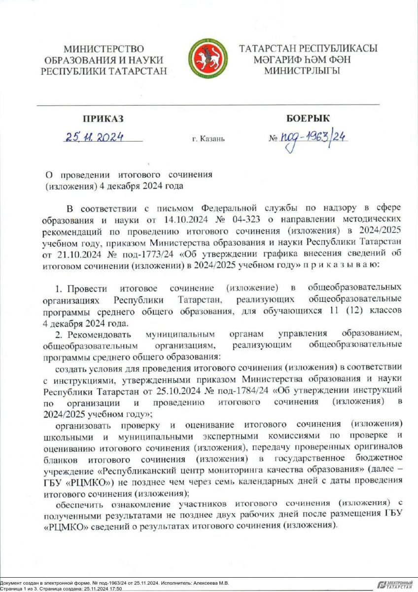 Приказ №под-1963/24 от 25.11.2024 "О проведении итогового сочинения (изложения) приказ
