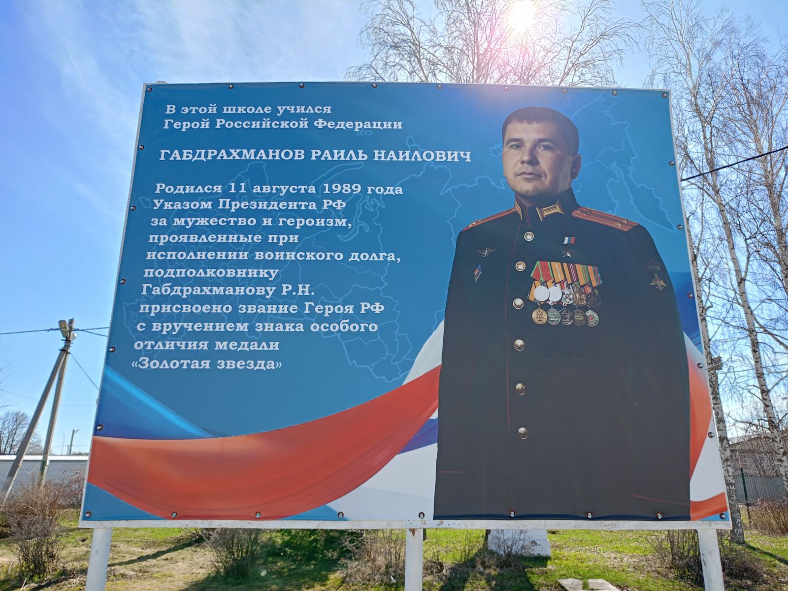 Каждое утро учеников, учителей и гостей нашей школы встречает баннер с изображением Габдрахманова Раиля — нашего героя, нашего современника. Его пример вдохновляет нас на новые достижения.
