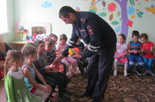 Инспектор ГИБДД провел с воспитанниками детского сада беседу о правилах безопасного поведения на дороге. Проверил знания детей по правилам дорожного двидения.