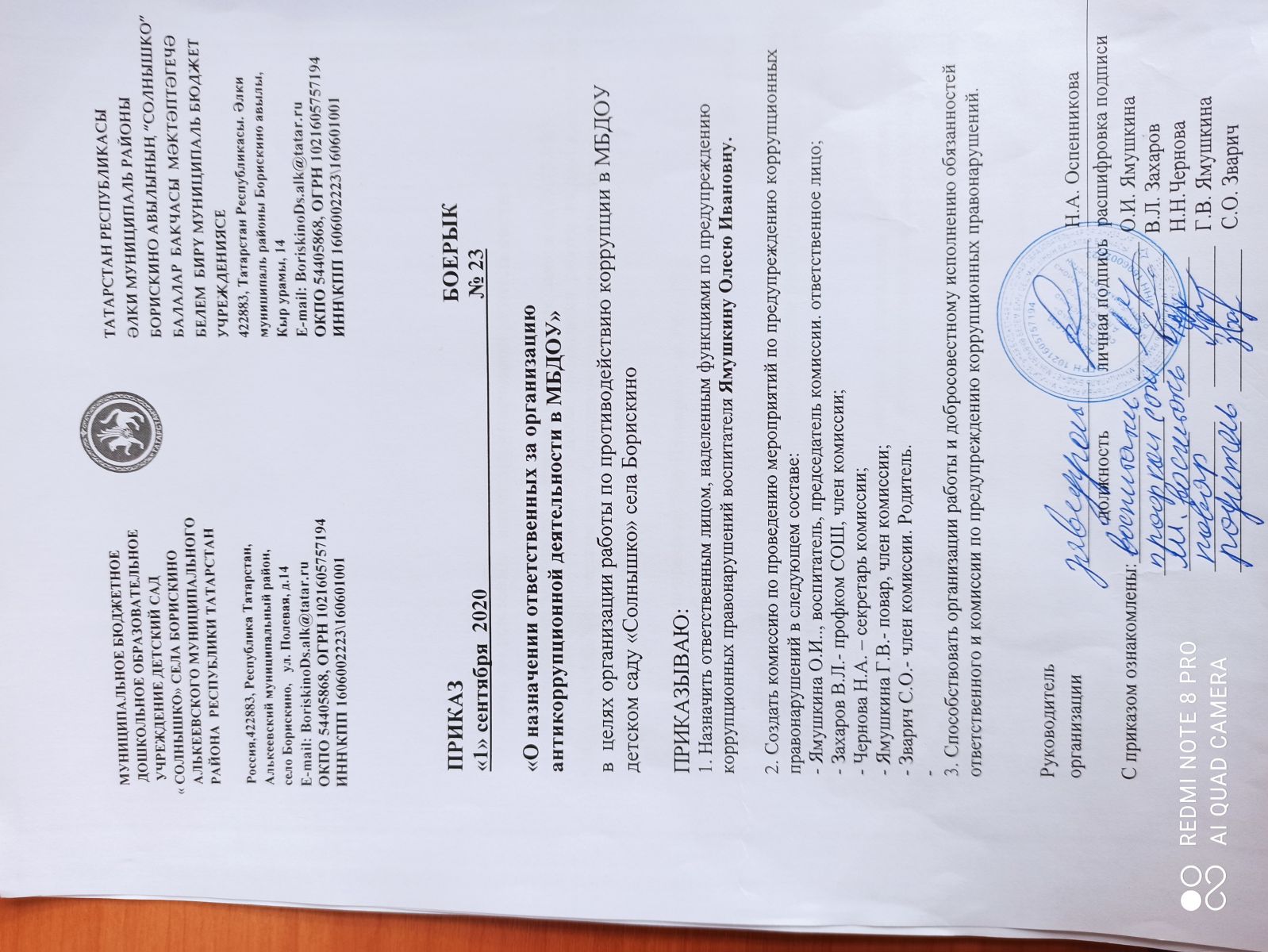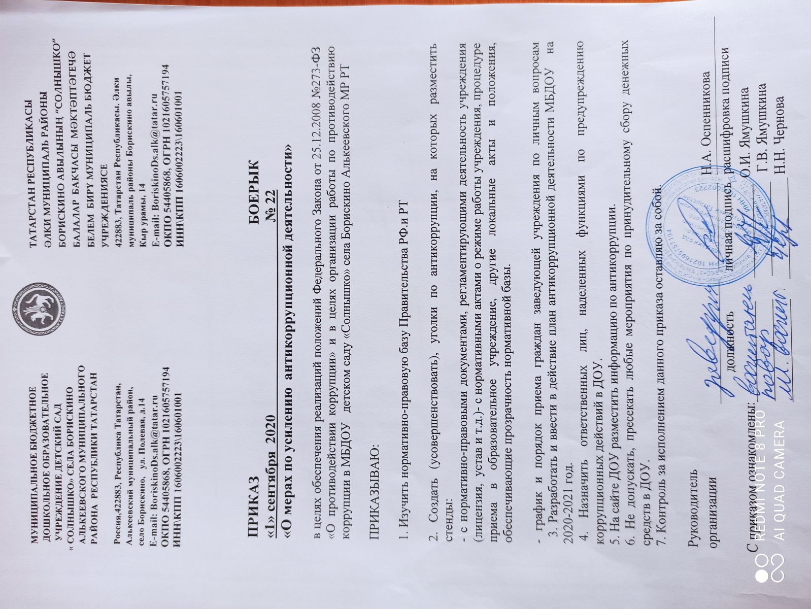Приказ об утверждении плана мероприятий по противодействию коррупции в МБДОУ детском саду "Солнышко" с.Борискино АМ РТ