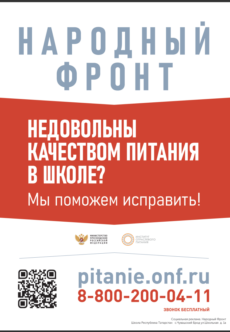 Устраивает ли качество питания в школе? Можно обратиться по бесплатному номеру или навести телефон на куар код на баннер и обратиться в Народный фронт.