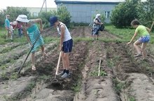 Во второй смене учащиеся лагеря "Непоседы" не только играют, соревнуются, но и занимаются полезным трудом на школьном огороде.