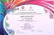 Поздравляем Маркову Ольгу - победителя республиканского детского фестиваля народного творчества "Без Берге". Руководитель Еликова М.Г.