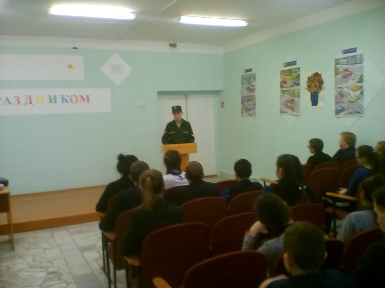 Сегодня в школе состоялась встреча учащихся 8-11 классов с выпускником школы - курсантом 2 курса Военной академии связи имени Маршала Советского Союза С.М. Буденного Гордеевым Савелием. Приятно, когда наши выпускники посещают свою родную школу. Савелий поделился с подрастающим поколением своим отношением к военной службе и впечатлениями об академии, выбранной специальности. В ходе беседы ему были заданы вопросы, касающиеся учебы, тренировок, обеда, отдыха и социального положения военнослужащих.