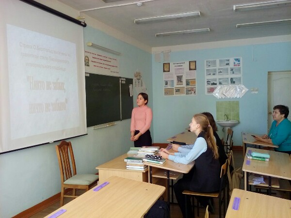 28 января 2019 года учитель русского языка и литературы Чубукова Н.Ю. провела открытый урок по литературе для учащихся 10 класса на тему «Поэты блокадного Ленинграда».