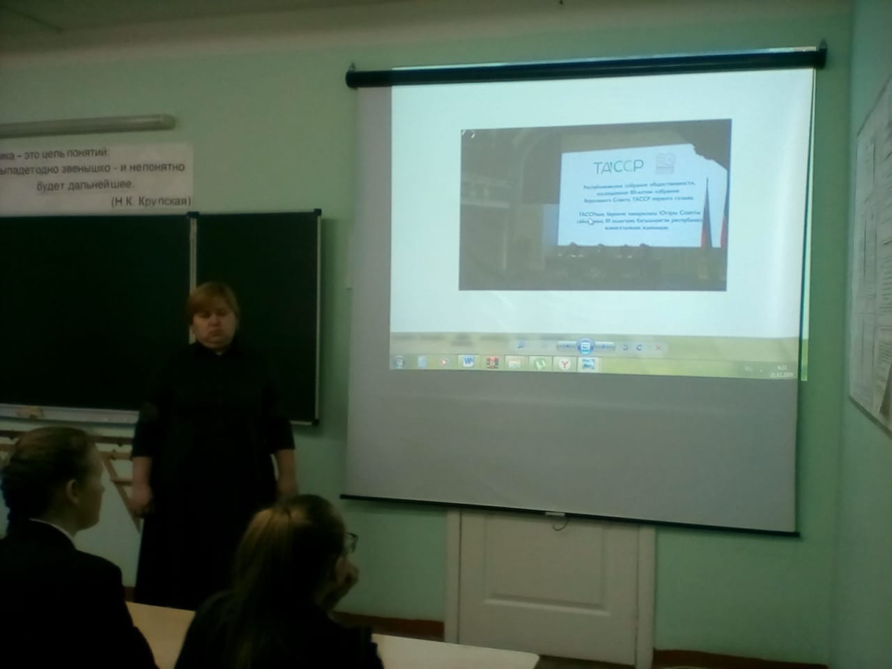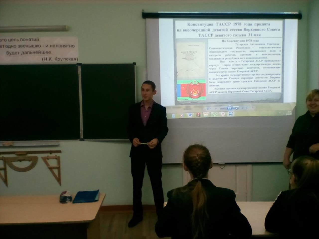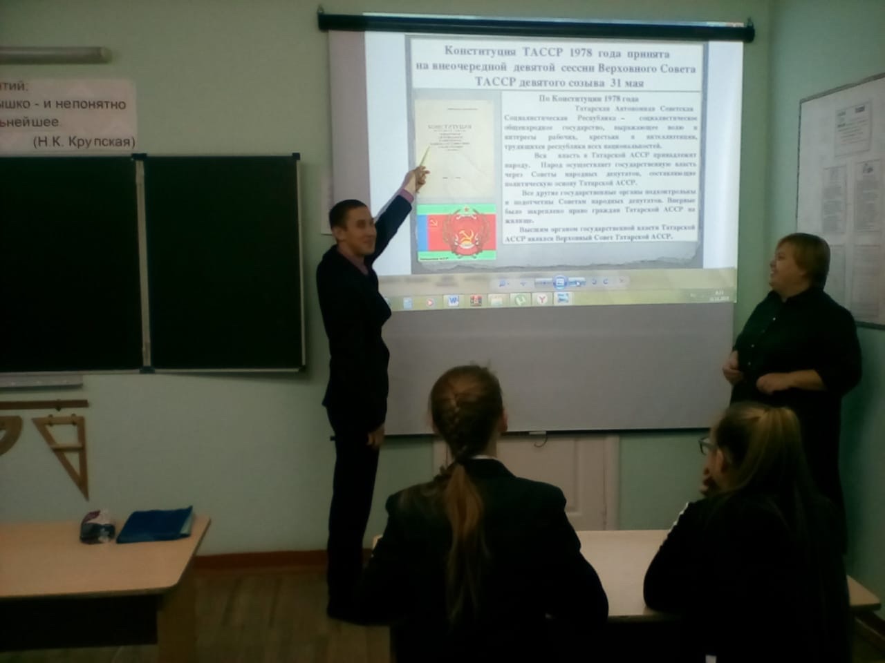 Сегодня в школе прошел единый урок для 9 - 11 классов посвященный 80 - летию избрания Верховного Совета ТАССР первго созыва. Урок провела классный руководитель 11 класса Кашкарова Н.Н.