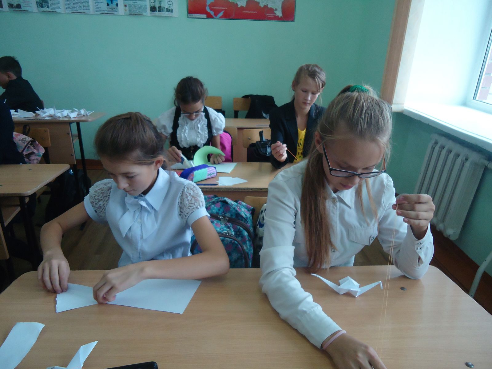 С целью привлечения внимания общественности к проблеме терроризма коллектив школы провел акцию "Белый журавль". Учащиеся и педагоги изготовили из белой бумаги журавлей в технике "оригами". В память о жертвах в г. Беслан. По окончании акции все журавлики учащиеся повесили на деревья (на территории школы).