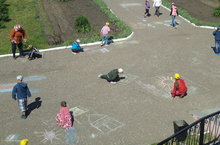 В рамках празднования Международного дня защиты детей Чернова А.В. и Варламова Е.В. провели конкурс рисунков на асфальте под девизом "Миру- мир!!!". Победителем стала Матвеева Ксения, в подарок она получила волейбольный мяч от председателя ООО "Хузангаевское" Чугунова Е.М.