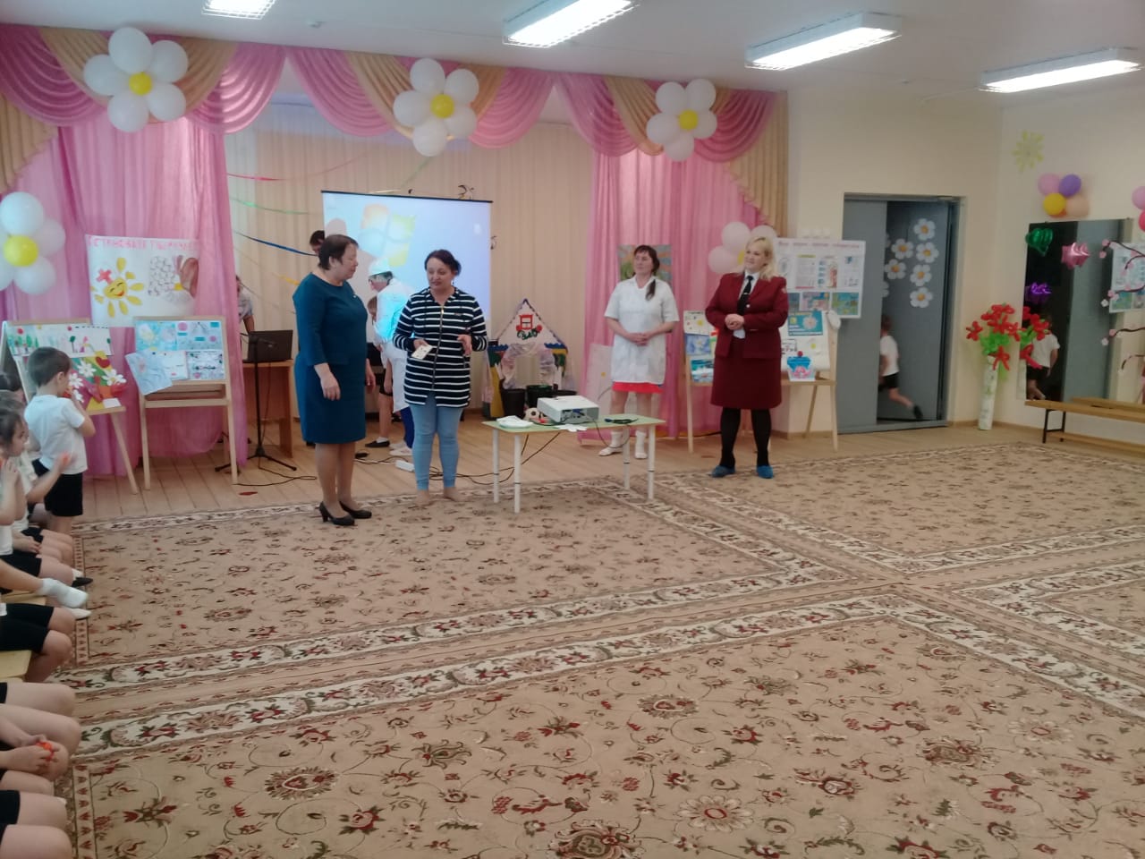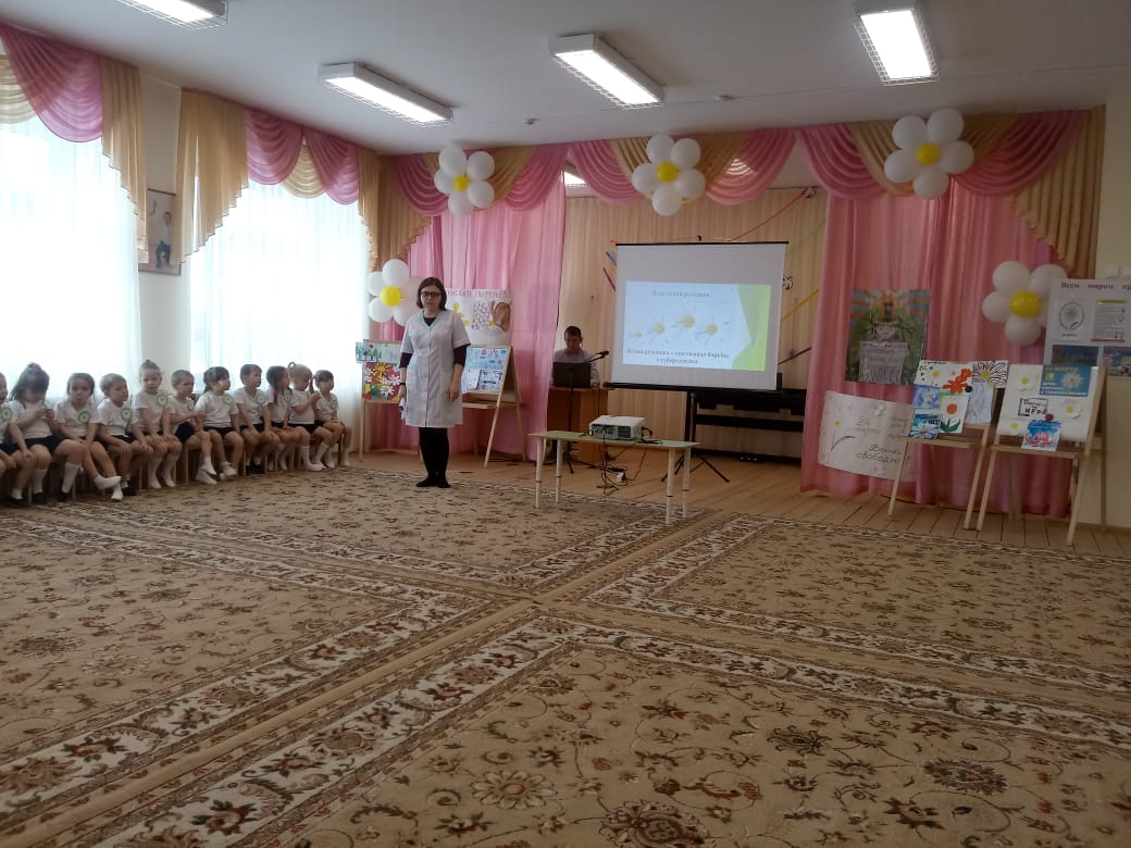Зал был оформлен ромашками из шаров, различными плакатами и рисунками на тему туберкулеза и здорового образа жизни. Оформили информационные материалы, буклеты для родителей по вопросам профилактики и распространения туберкулеза: «Туберкулез — это серьезно!», «Туберкулез излечим!», «Как спасти ребенка от туберкулеза», «Не допусти туберкулез». Организовали конкурс детских рисунков «Я здоровье берегу, сам себе я помогу».