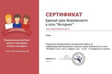 Наши дети прошли на сайте Единый урок РФ тест по безопасности в сети Интернет и получили сертификаты,а родители памятки "Безопасность детей в Интернете"