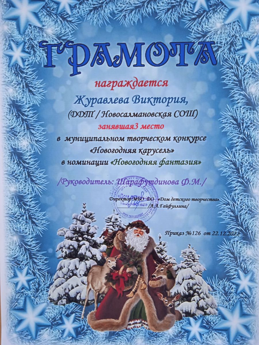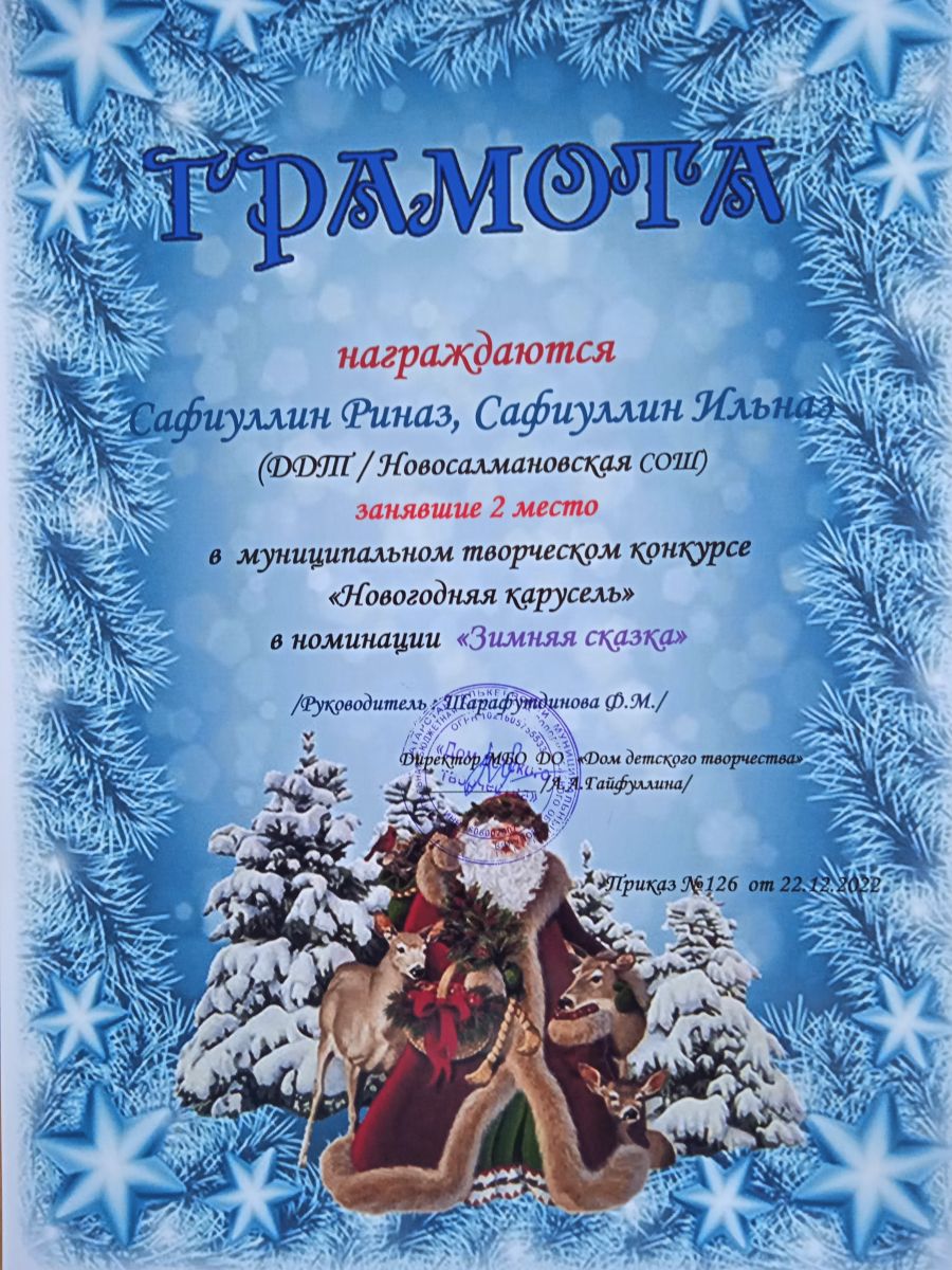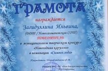 Учащиеся нашей школы приняли активное участие в муниципальном творческом конкурсе "Новогодняя карусель". В номинации "Символ года" стала победителем Загидуллина Ильвина. Сафиуллины Риназ и Ильназ заняли 2 место в номинации "Зимняя сказка", 3 место в номинации "Новогоняя фантазия" заняла Журавлева Виктория. Поздравляем наших учащихся!