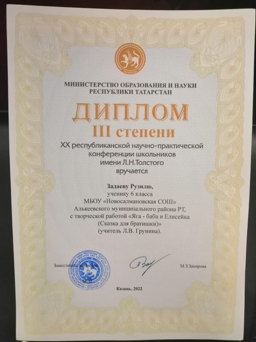 Задаев Рузиль, учащийся нашей школы, 21 октября принял участие в республиканской научной конференции учащихся им. Л.Н.Толстого. Рузиль достойно защитил научную работу перед комиссией в г. Казань, ответив на все дополнительные вопросы и стал обладателем Диплома III степени. Поздравляем Рузиля и его руководителя учителя русского языка и литературы Грунину Людмилу Валерьеву!