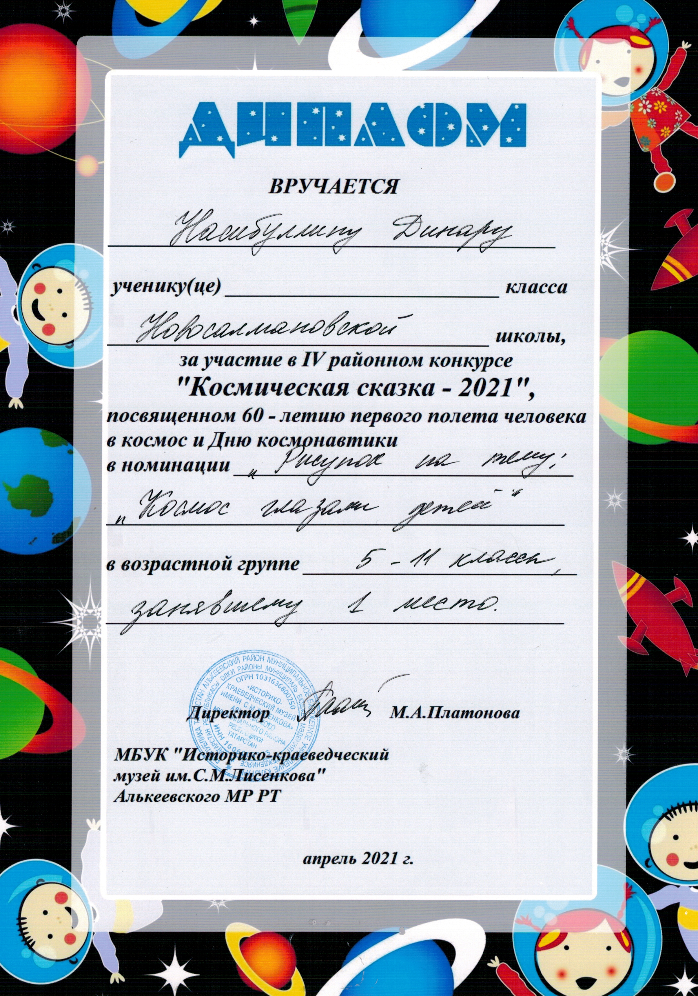 Насибуллин Динар, ученик 10 класса, занял 1 место в конкурсе рисунко "Космическая сказка-2021", посвященном 60-летию первого полета человека в космос и Дню космонавтики в номинации "Космос глазами детей".