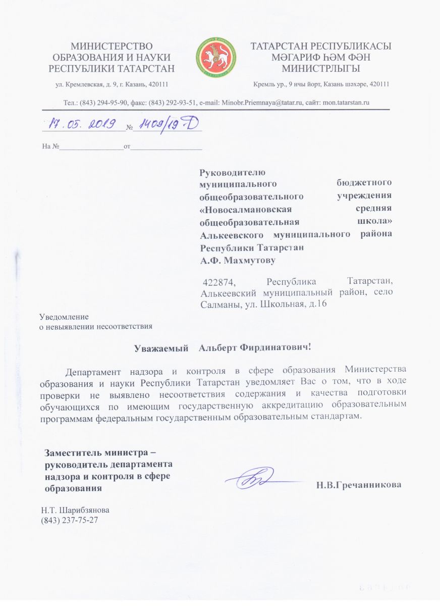Уведомление о невыявлении несоотвествия № 1409/19Д от17.05.2019