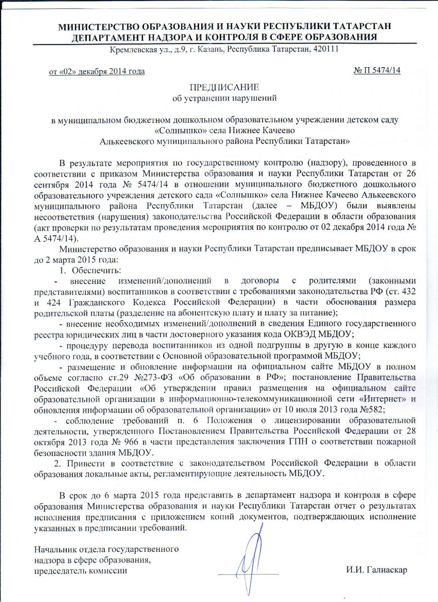 Предписание об устранении нарушений от 27 января 2021 года МО и Н РТ Департамент надзора и контроля в сфере образования