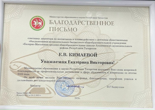 26го декабря, в рамках стратегической сессии по вопросам развития воспитательных сред в образовательных организациях РТ и ресурсов для поддержки педагогических работников, на базе лабораторного комплекса Автономной некоммерческой организации "Казанский открытый университет талантов 2.0" по итогам первого полугодия 2023-2024 учебного года советники директоров по воспитанию Базарно-Матакской гимназии имени Наби Даули Зайдуллина А.С.и БМСОШ Кимаева Е.В. были награждены Благодарственными письмами Министра образования РТ, вручила А.М.Асадуллина