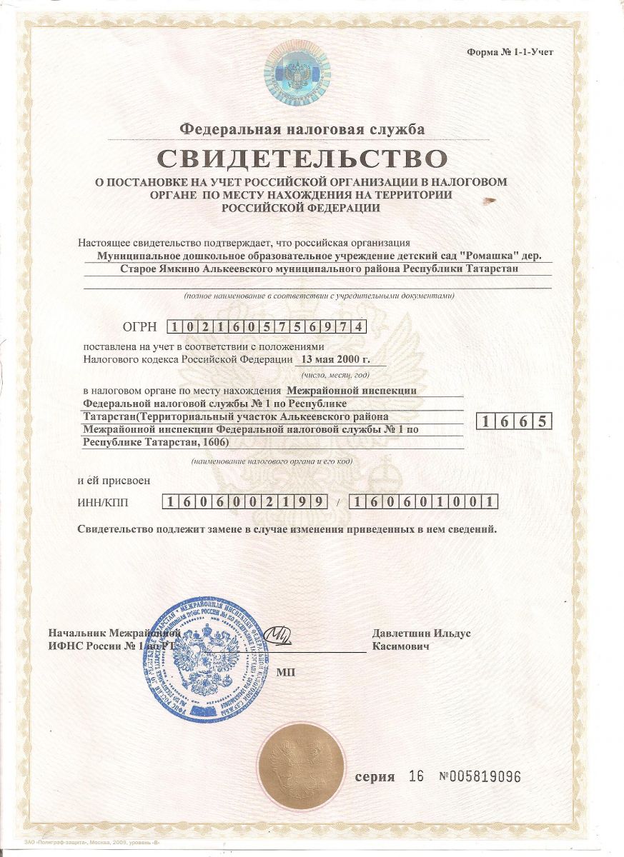 Свидетельство о постановке на учет в налоговом органе