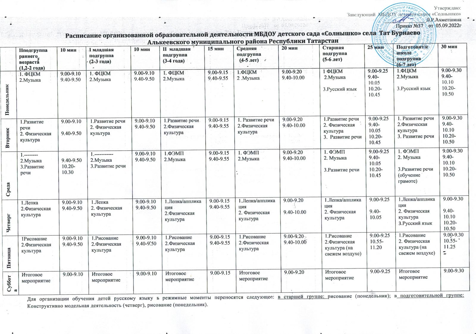 Расписание организованной образовательной деятельности МБДОУ детского сада "Солнышко"