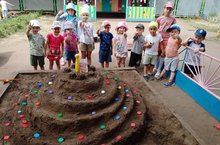В рамках недели "Песочных замков" дети младшей и старшей групп построили из песка огромный торт и песочный городок .