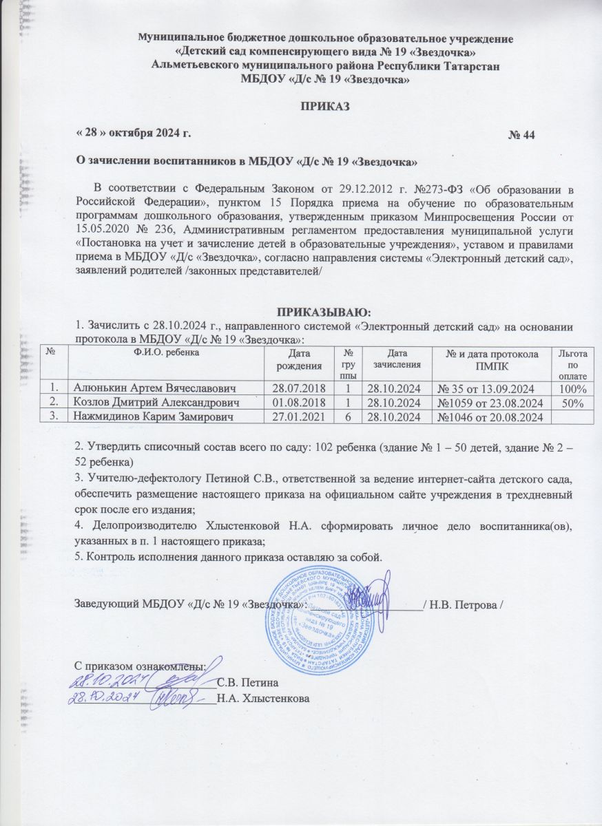 Приказ о зачислении №44 от 28.10.2024