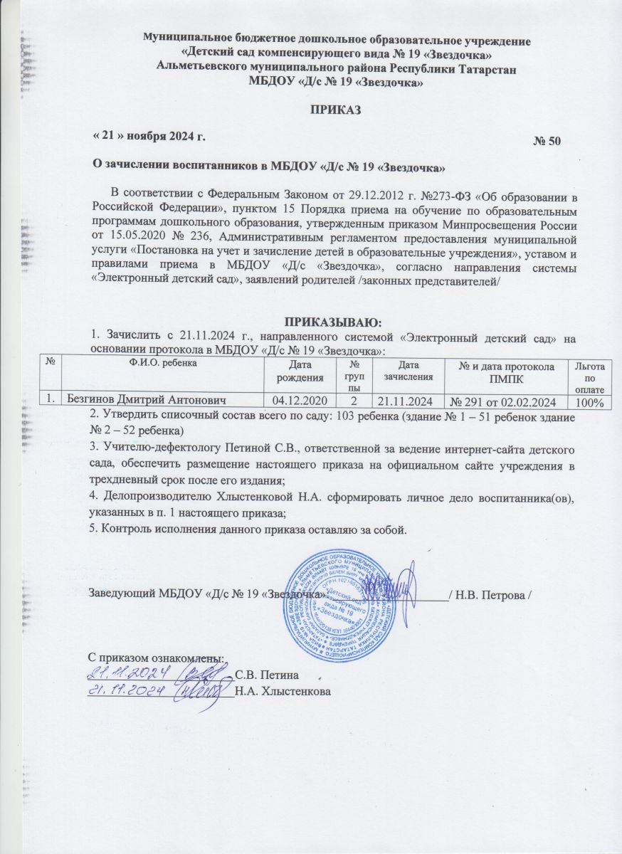 Приказ о зачислении №50 от 21.11.2024