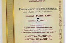 Поздравляем маму МБДОУ "Д/с №21 "Гвоздика" Миннехайрову Рузилю Маулетовну, команда "Родители" занявшую 1 место в интерактивной игре по профилактике и предупреждению ДДТТ и формированию правил безопасного поведения на дорогах среди педагогов и родителей ДОУ АМР РТ