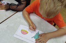 Перед детьми стоит интересная задача: дорисовать вторую половинку изображения по пунктирным линиям и раскрасить рисунок, ориентируясь на цветной образец. Можно усложнить задание, предложить рисунки без пунктирных линий.