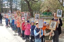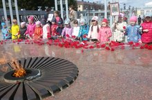 Каждый ребёнок нес в руках фотографию, чтобы рассказать всем о своем герое Великой отечественной войны и почтить память не дожившего до наших дней ветерана. Дружной колонной мы с детьми прошли по улицам города. Затем прошли к вечному огню, где дети традиционно возложили цветы в память о героях войны.
