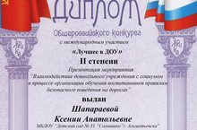 Поздравляем коллектив ДОУ № 31 "Солнышко" с получением диплома II степени общероосийского конкурса с международным участием "Лучшее в ДОУ" в номинации "Презентация мероприятия «Взаимодействие дошкольного учреждения с социумом в процессе организации обучения воспитанников правилам безопасного поведения на дорогах». Желаем дальнейших творческих успехов!!!
