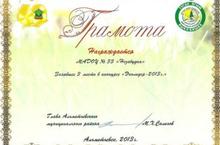 В рамках городского конкурса "Эколидер - 2013" коллектив МА ДОУ №33 "Незабудка" занявший 3 место был награжден грамотой Главы Альметьевского муниципального района.