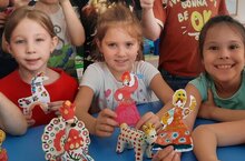 Гр."Весёлые ребята"вырезали и украсили силуэты элементами дымковской росписи.