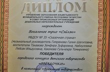 Поздравляем музыкального руководителя Гимранову Галию Шагитовну, воспитателей Тахавову Земфиру Зуфаровну, Набиуллину Ляйсан Ильдусовну, Каюмову Гульчехру Темировну с победой воспитанников в городском конкурсе детского творчества «Звездочки» в номинации «Вокальное творчество».