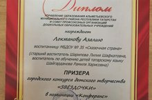 Поздравляем Локманову Азалию воспитанницу подготовительной группы « Капельки», воспитателя (тат.яз.) Рамилю Харисовну, старшего воспитателя Лилию Шафкатовну призеров городского конкурса детского творчества «Звездочки» в номинации «Конферанс».