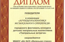 23 ноября МБДОУ №35 "Маленькая страна" принял участие в городском отборочном туре фестивале – конкурсе детских театральных коллективов «Театральные встречи» среди ДОУ АМР. Воспитанники старшей группы «Крепыш» показали музыкальную сказку «Дело было в лесу», музыка и либретто Л. Олифировой, руководители воспитатель Лебедева И.М и музыкальный руководитель Хасаншишина Л.И.