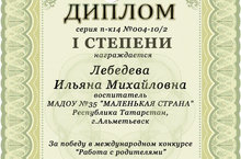 Поздравляем воспитателя группы «Крепыш» Лебедеву Ильяну Михайловну с победой – 1 место в международном конкурсе для педагогов «Работа с родителями».