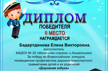 Поздравляем воспитателя Бадертинову Елену Викторовну с победой (2 место) во Всероссийском конкурсе, посвященном профилактике дорожно-транспортного травматизма детей и их родителей «Дорожная азбука» в номинации «Мероприятие, посвященное профилактике дорожно-транспортного травматизма для детей и родителей».